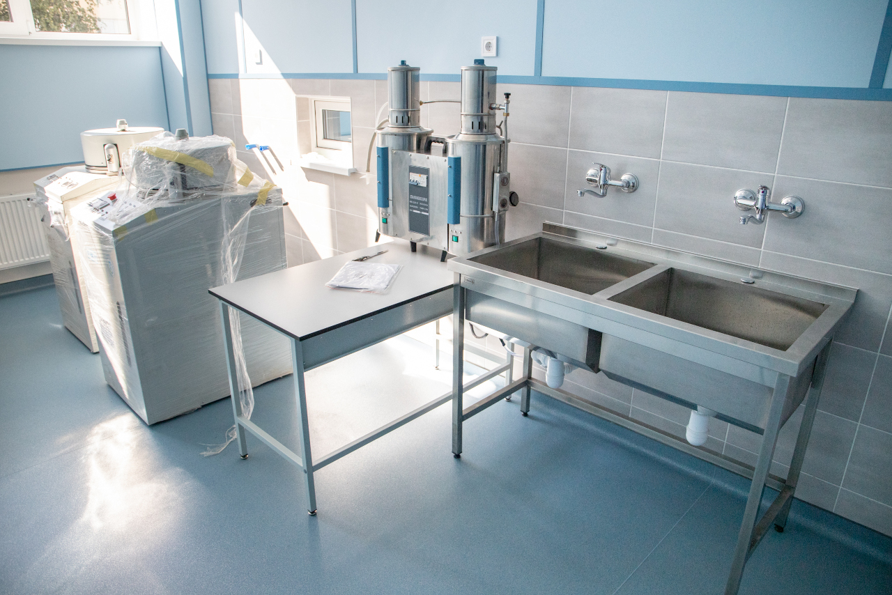 В рамках оснащения были поставлены биохимические анализаторы для анализа крови, гематологические анализаторы для исследования клеточного состава крови, иммуноферментные анализаторы для диагностики инфекционных заболеваний и определения гормонов, газоанализаторы для исследования кислотно-щелочного баланса в крови, коагулометры для оценки свертываемости крови, вытяжные шкафы и столы для работы с реактивами и химическими веществами, шкафы для хранения медицинских реактивов, микроскопы (световые или электронные) для анализа структур клеток, центрифуги для разделения компонентов биологических материалов, автоклавы для стерилизации инструментов.